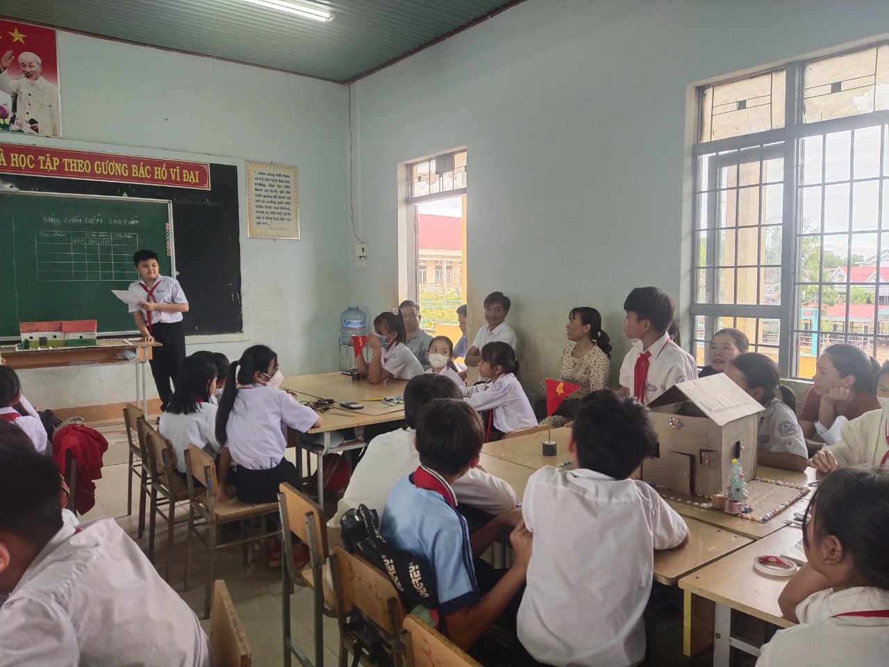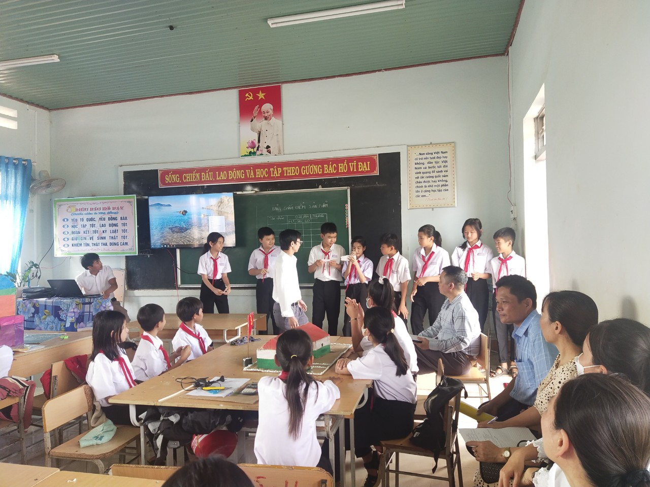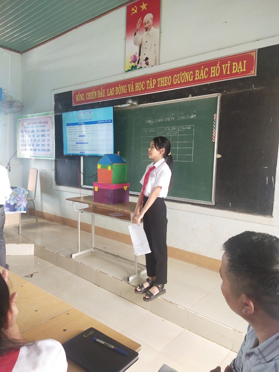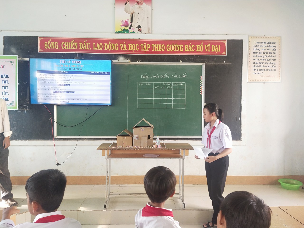 Sản phẩm học tập ứng dụng của 4 nhóm là những mô hình “Ngôi nhà mơ ước” được học sinh giới thiệu thông qua một cách ngắn gọn, khoa học và linh hoạt. Sau phần giới thiệu sản phẩm của mỗi nhóm, thành viên các nhóm khác đặt các câu hỏi phản biện nhằm tìm hiểu rõ hơn về quy trình chế tạo, nguyên vật liệu, chức năng, công dụng và giá thành của sản phẩm. Phần trả lời của các nhóm rất chi tiết và thuyết phục. Trên cơ sở đó giáo viên nhận xét, đánh giá sản phẩm và gợi mở những hướng sáng tạo mới, ứng dụng mới cho học sinh. Tiết dạy minh họa được khép lại trong tinh thần vui tươi phấn khởi và vẹn nguyên cảm hứng học tập say mê của tập thể học sinh lớp 6A3 cũng như thầy cô giáo tham dự.