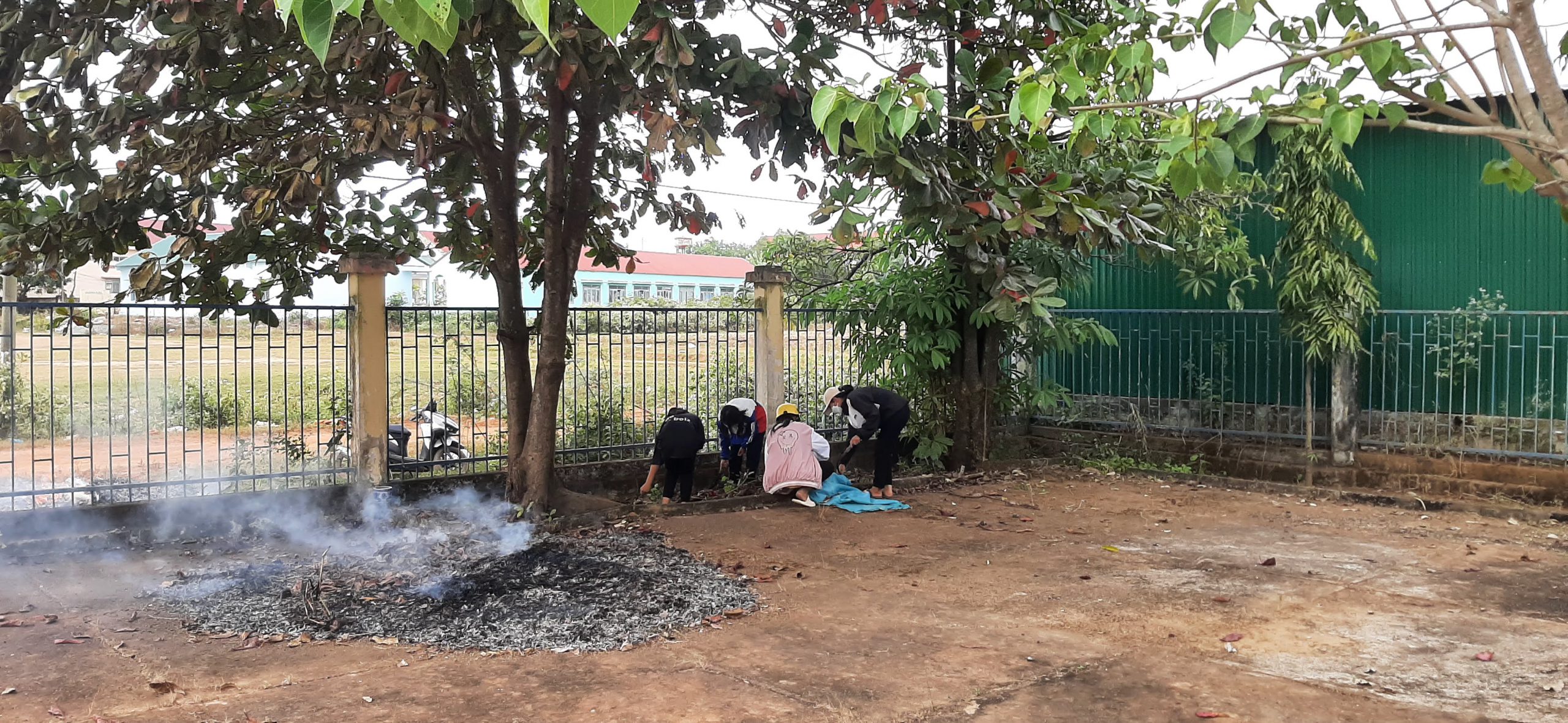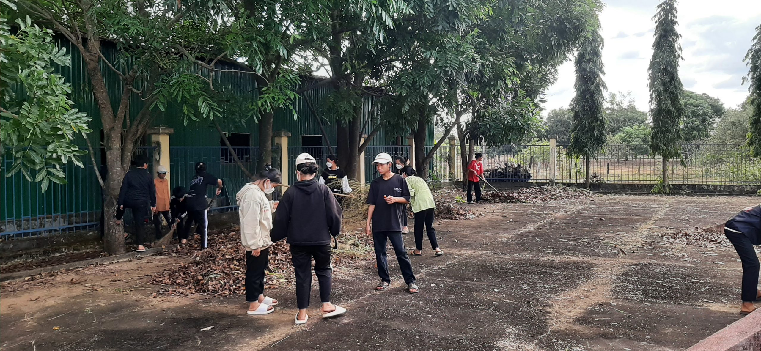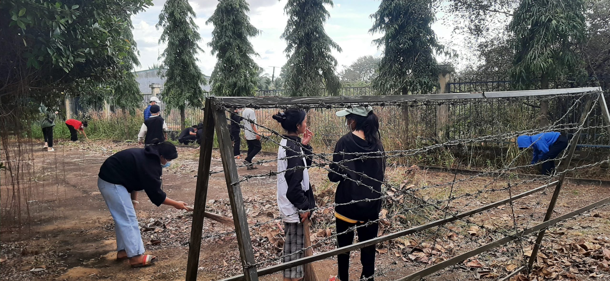 Các bạn Đội viên của Liên đội dọn dẹp vệ sinh khu vực Đài bia tưởng niệm xã Ea Rốk.