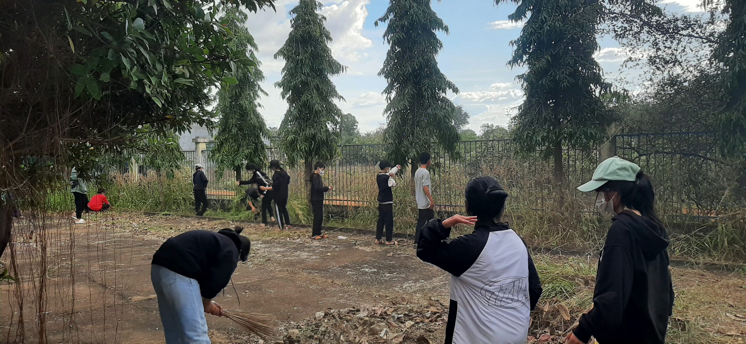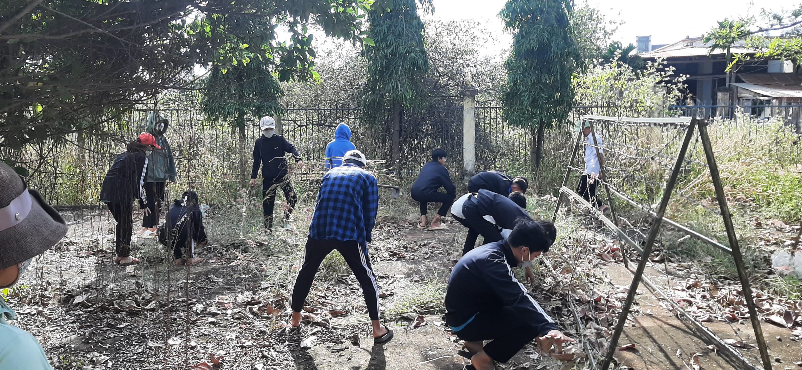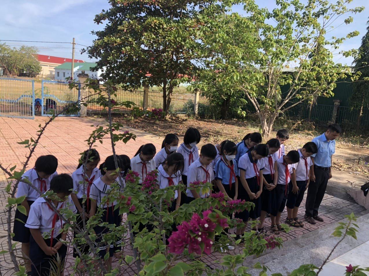 Các bạn Đội viên của Liên đội dọn dẹp vệ sinh khu vực Đài bia tưởng niệm xã Ea Rốk.