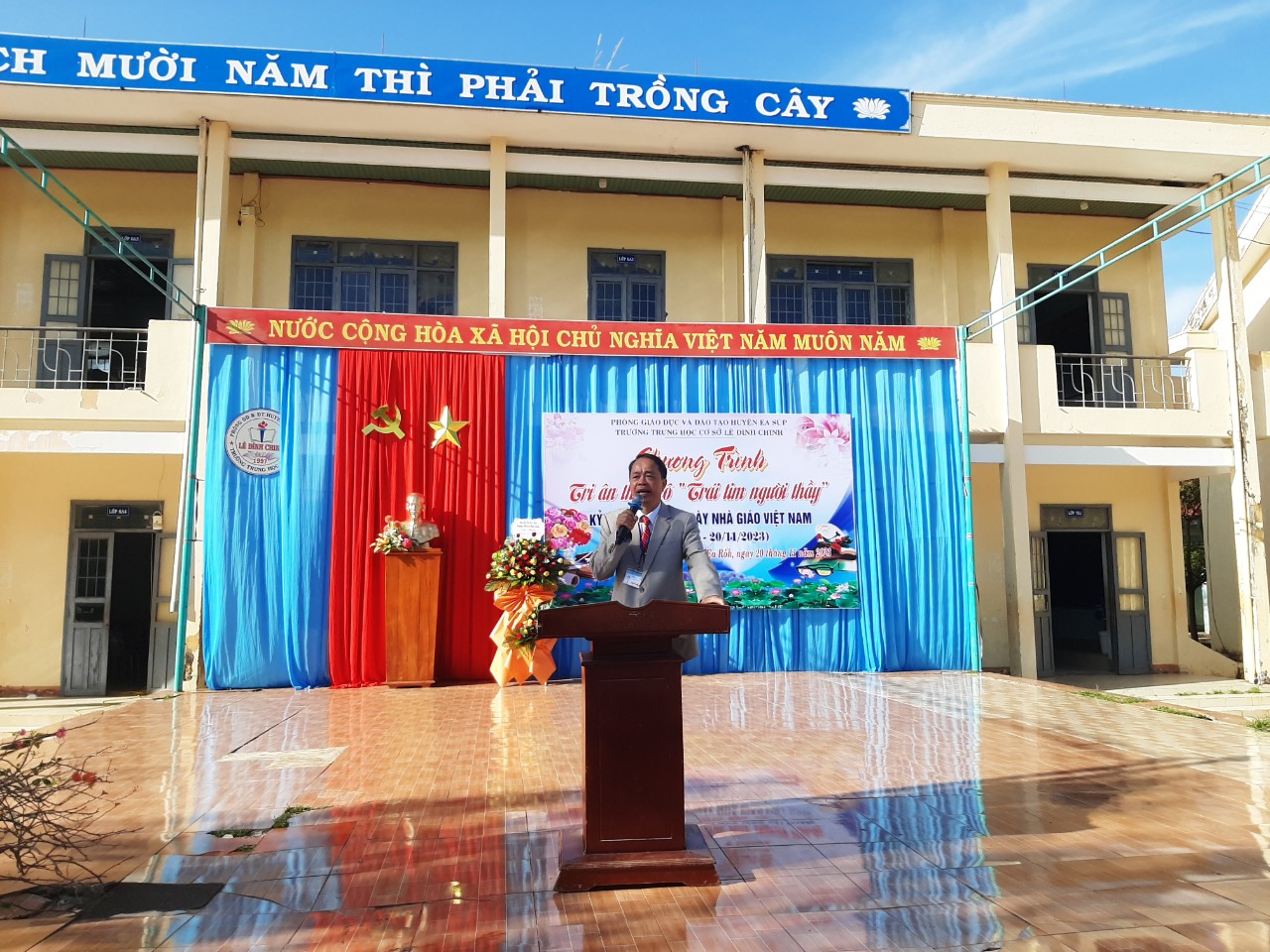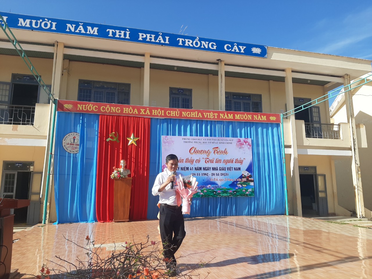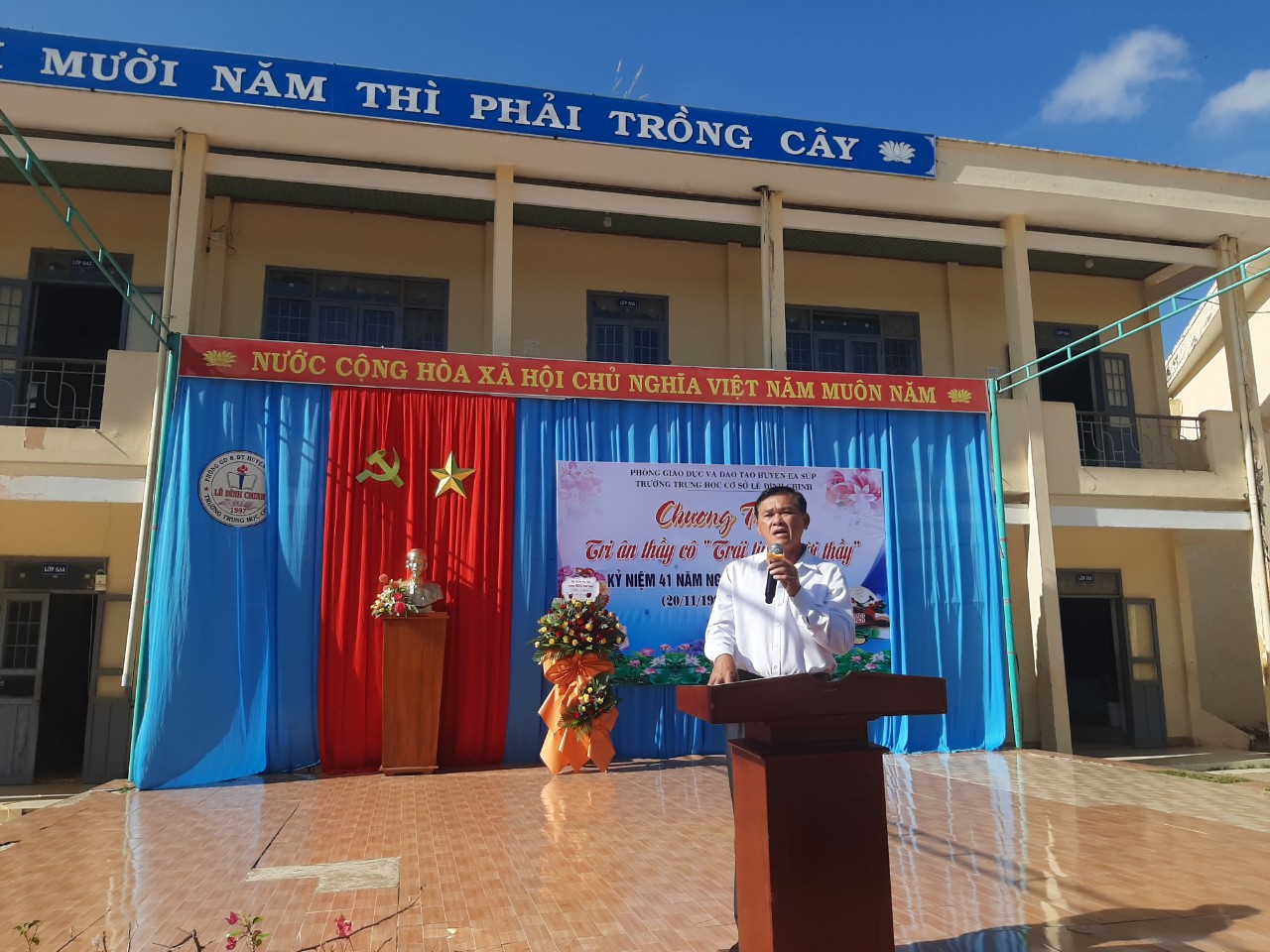 Ôn lại truyền thống tốt đẹp Ngày Nhà giáo Việt Nam 20/11, Thầy giáo Hứa Văn Thành – Bí thư chi bộ, Hiệu trưởng nhà trường bày tỏ niềm tự hào về các thế hệ nhà giáo cùng các thế hệ học trò đã cùng nhau làm nên những thành tích vẻ vang của ngôi trường THCS Lê Đình Chinh. Đồng thời gửi gắm những kì vọng, niềm tin vào các em học sinh sẽ là niềm tự hào, vinh dự của nhà trường và thầy cô. Thầy hiệu trưởng đã nhấn mạnh truyền thống “Tôn sư trọng đạo” của dân tộc và gửi lời tri ân sâu sắc đến những người thầy đáng kính, gửi lời chúc sức khỏe, hạnh phúc tới các thầy cô đang giảng dạy; gửi lời cảm ơn trước sự tin yêu, trao gửi cũng như đồng hành của các bậc phụ huynh đối với các hoạt động giáo dục của nhà trường.
