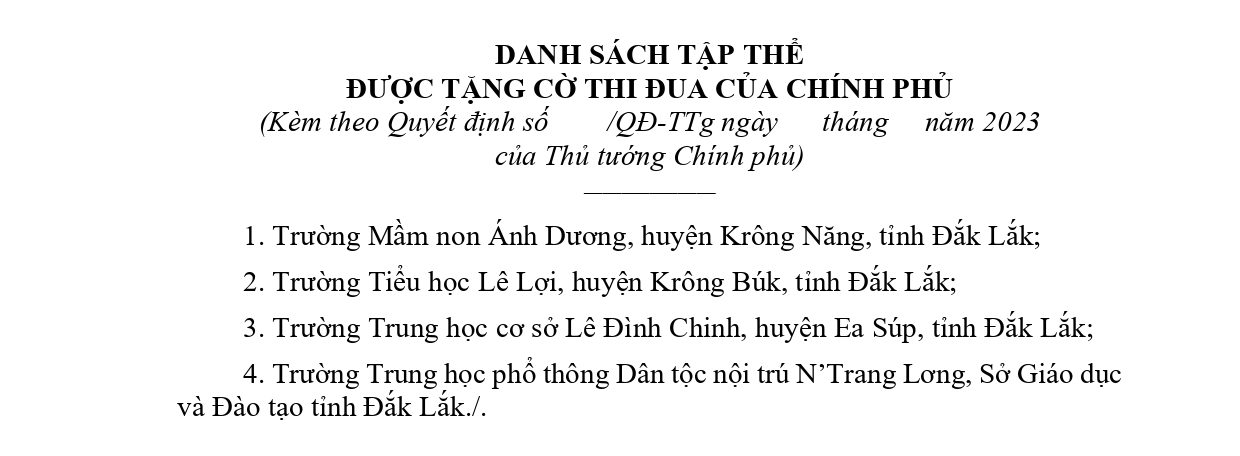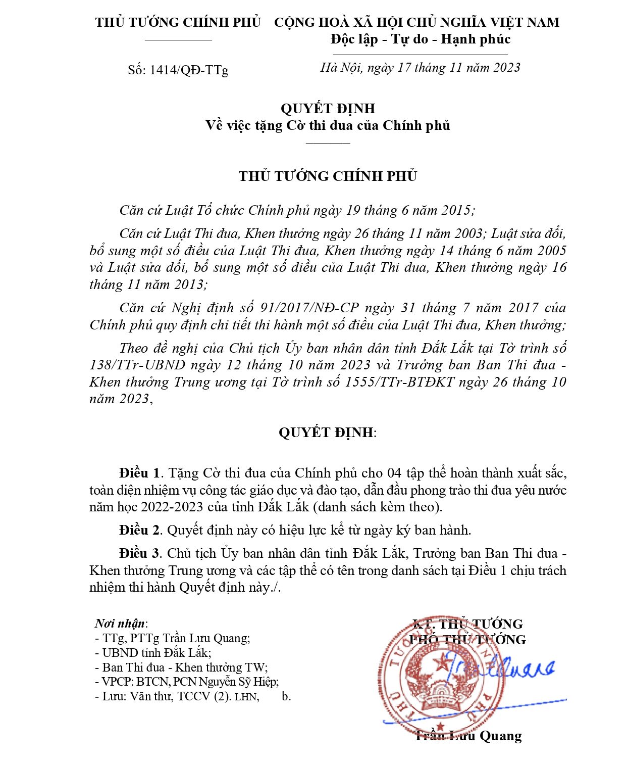 Đặc biệt, nhà trường đón nhận tin vui với Quyết định số 1414/QĐ-TTg, ngày 17/11/2023 của Thủ tướng Chính phủ về việc tặng cờ thi đua cho tập thể hoàn thành xuất sắc,toàn diện nhiệm vụ công tác giáo dục và đào tạo, dẫn đầu phong trào thi đua yêu nước năm học 2022-2023 của tỉnh Đắk Lắk.