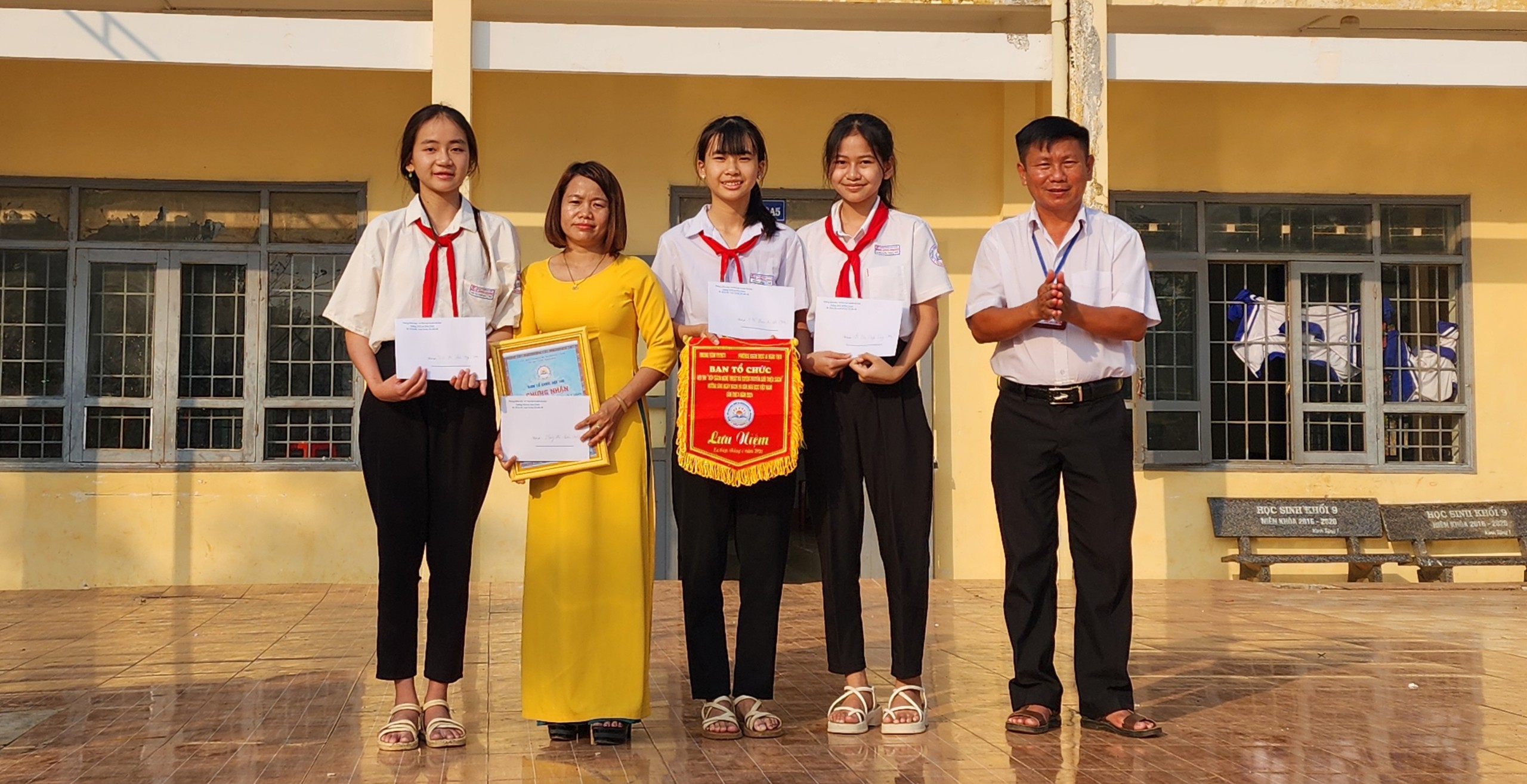 Cô Hoàng Thị Toàn – Nhân viên Thư viện nhà trường cùng các em nhận giải từ Ban tổ chức
